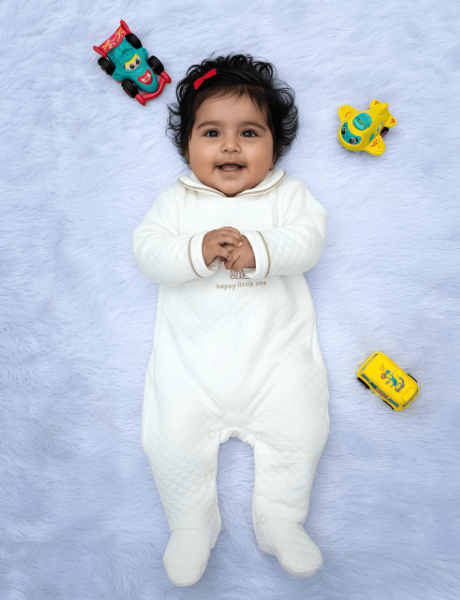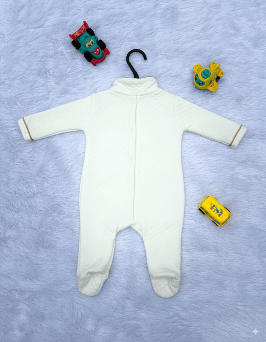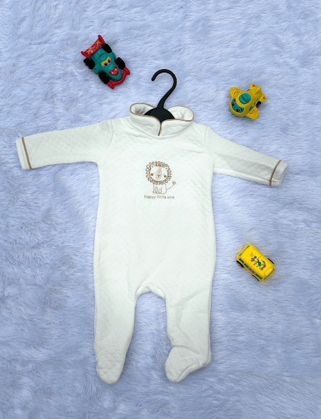 Premium Export Quality, Full cover Rombar, Wrap your little one in cozy comfort with this quilted full-body baby sleepsuit. The soft white fabric features an adorable embroidered lion and the phrase “Happy Little One,” making it perfect for bedtime, lounging, or gifting. The gentle, breathable material keeps your baby warm without overheating, while the covered feet ensure full-body warmth.